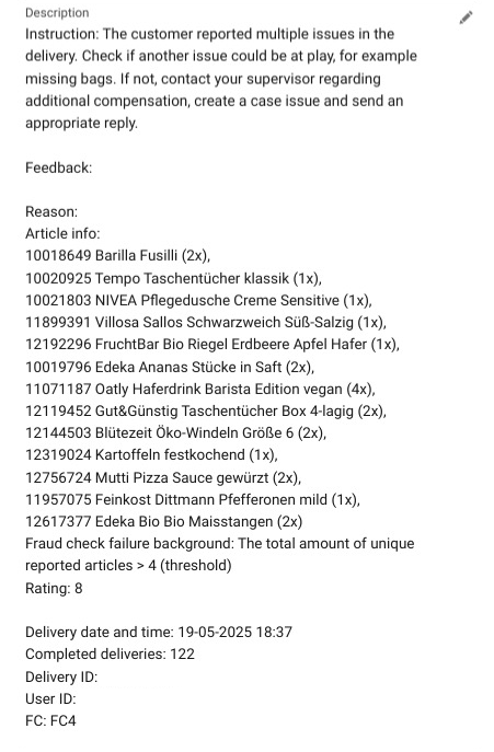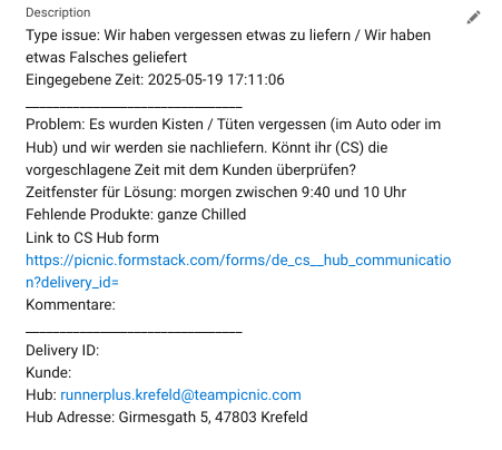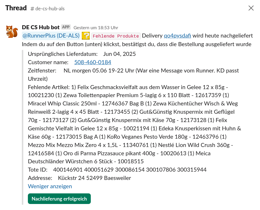 Hier hat die Kund:in nicht ihre vollständige Lieferung erhalten und es ist dem Runner aufgefallen, dass alle gekühlten Produkte fehlen. Als Lösung schlug uns der Runner+ eine Nachlieferung am nächsten Tag zwischen 9:40-10 Uhr vor. Wir klären diesen Vorschlag direkt im Case mit der Kundin ab und teilen die Rückmeldung anschließend im Thread des erstellten Hubbots dem Runner+ mit.