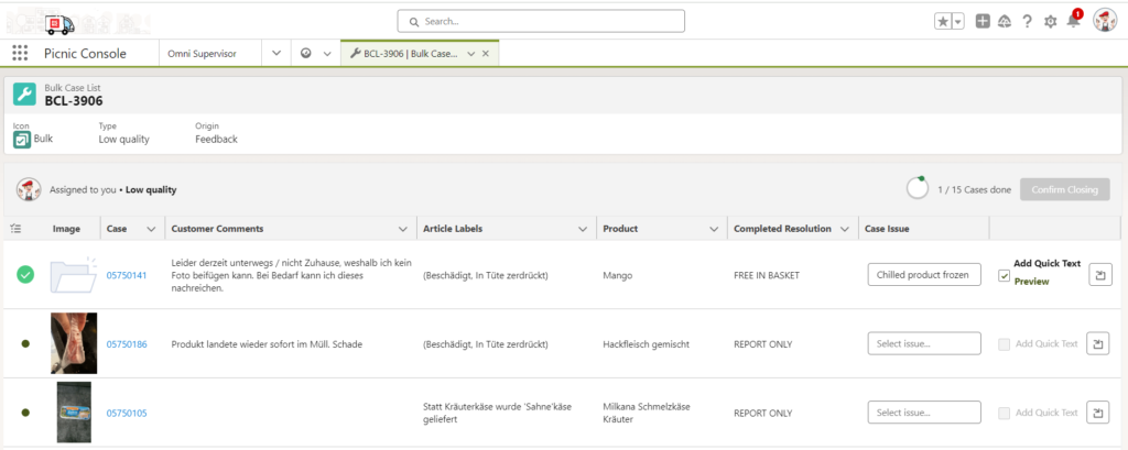 - Wiederhole den Vorgang für jeden Case in der Liste (die Bulk Liste können 10+ Cases beinhalten). Sobald jeder Case bearbeitet wurde, kann die gesamte Liste oben rechts unter Confirm Closing geschlossen werden. Somit werden alle Cases geclosed und alle Quicktexte rausgeschickt.