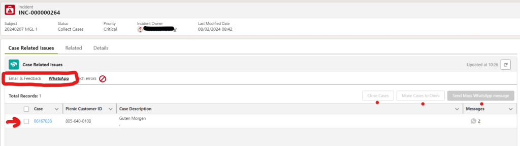 Das Incident Management Tool stellt sicher, dass Cases von bestimmten Kunden aus dem Backlog entfernt werden. Mit diesem Tool können wir Massenantworten an Kund:innen senden, die uns wegen eines Vorfalls kontaktieren. Es ist auch möglich, Cases zurück in den Backlog zu schicken, wenn sie nicht mit dem laufenden Incident in Verbindung stehen oder wenn sie eine persönliche Antwort erfordern.