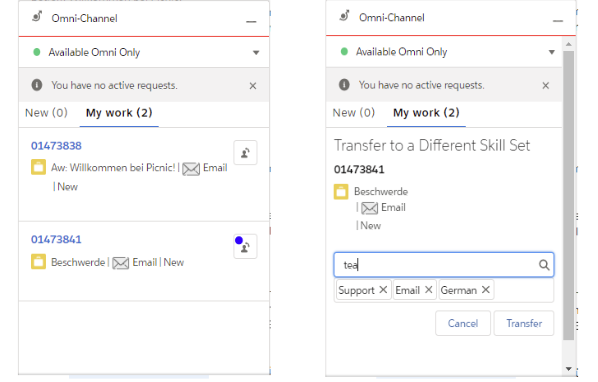 Du kannst deinen Case transferieren, indem du im Omnichannel auf My Work und dann auf den jeweiligen Case rechts auf das Männchen klickst. Im zweiten Schritt kannst du die Skills anpassen und den richtigen Skill hinzufügen.