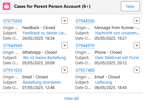 Cases for Parent Account ist eine Ansicht der sechs letzten Cases von Kund:innen. Hier kannst du sehen, ob sich die Person schon einmal gemeldet hat. Hab immer einen Blick darauf, bevor du den Kund:innen antwortest. Vielleicht wurde die Frage ja schon beantwortet! Eine Ansicht der gesamten Case-Historie der letzten drei Monaten erhältst du, wenn du auf View all klickst.