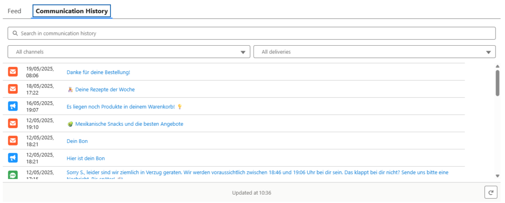 Unter Communication History kannst du jegliche Kommunikation mit dem Kunden nachlesen: SMS, Promo Mails, Einkaufbons, etc. Wenn du für eine bestimmte Bestellung die passende Kommunikation raussuchen möchtest, kannst du dies auf Delivery Ebene filtern.