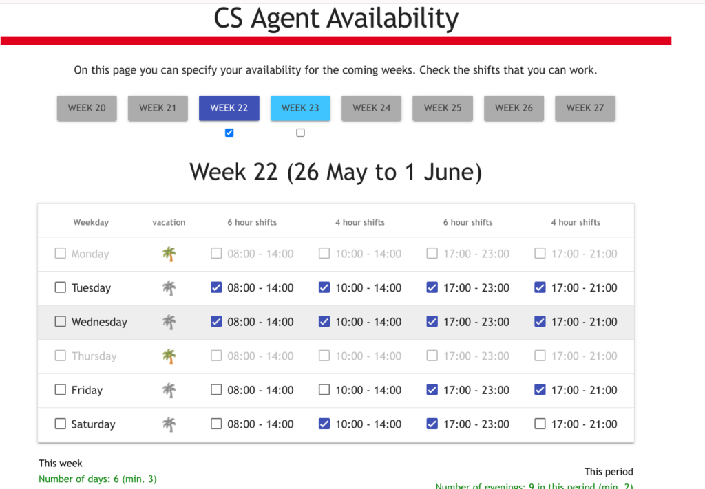 Denke bitte daran, deine Urlaubstage auch einzutragen, wenn du deine Verfügbarkeiten für diesen Zeitraum abgibst. Wähle dafür einfach die Palme aus, wenn du an einem oder mehreren Tagen Urlaub hast.